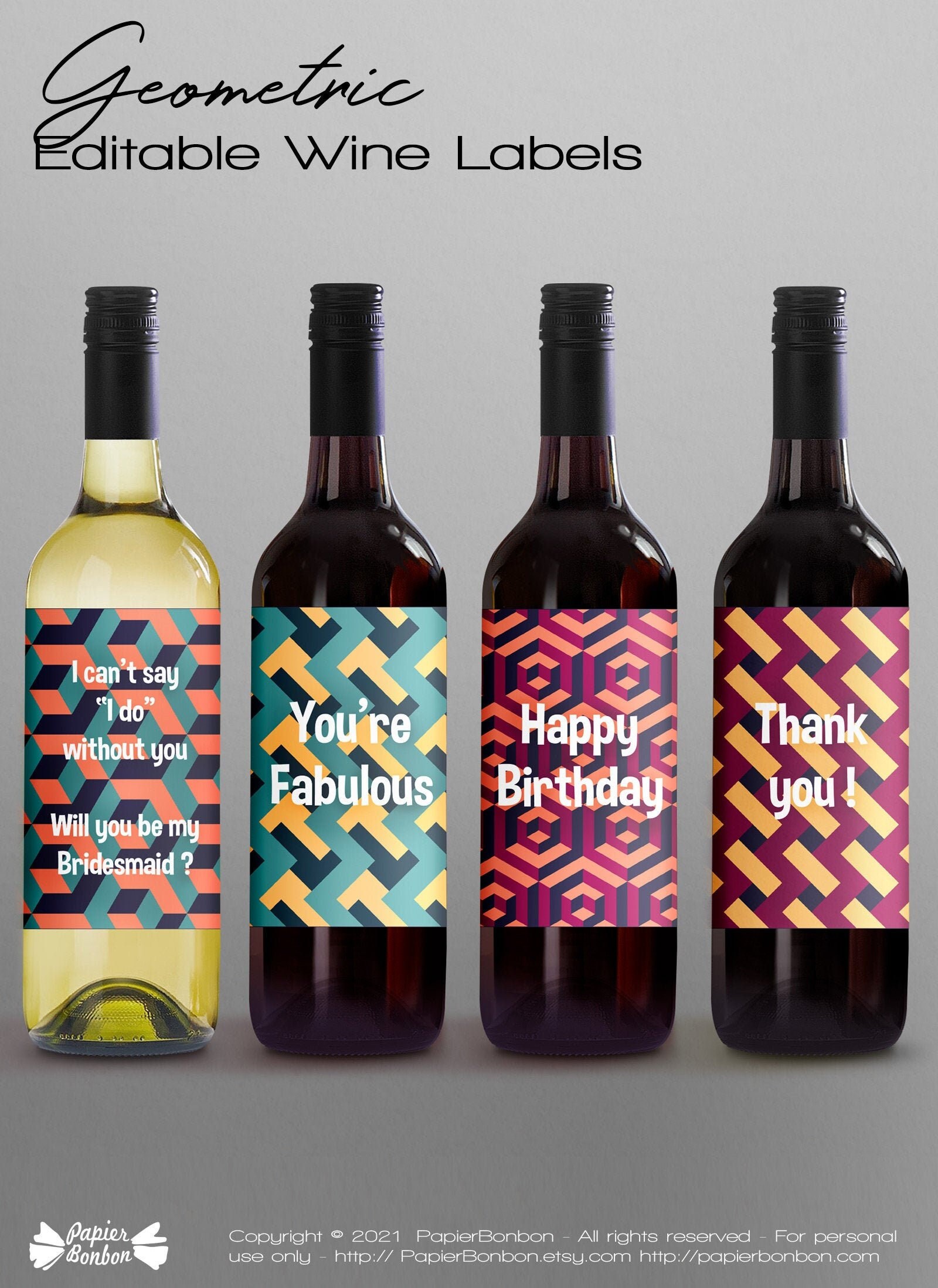 Personalised Bridesmaid Wine Bottle Label, Any Wording and Occasion ... Personalised custom bottle label - Perfect gift for any occasion; Printed on premium glossy adhesive paper ready to apply to your chosen bottle; Designed for standard 750ml bottles - other sizes available on request; Make that event or occasion extra special with a custom bottle label